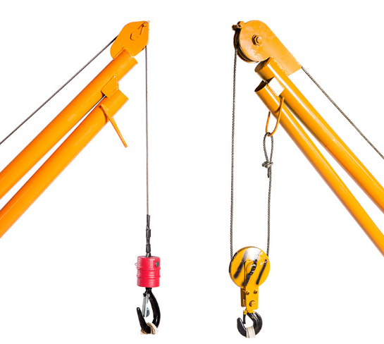 吊臂的頂端大多為定滑輪設計,這也是傳動鋼絲繩的重要裝置,利用定滑輪可以改變力的方向從而達到提高效率的目的。除了頂端的定滑輪,吊臂的下方,也就是處於下層的臂管有一個固定的吊環,這個吊環則目的是為大菠萝视频污APP增加了一種吊運方式,用它來連接鋼絲繩末端,此時的滑輪吊鉤形成了一個動滑輪,整體就構成了一個滑輪組,改變力的方向的同時又可以節省力氣,這就是它的設計意義。
