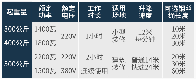 此產品體積小、重量輕、小巧操作方便,采用380V/220V電壓,適用於裝潢、吊運作業、安裝設備、搬家公司、工廠、車間、輕工、重工、維修、倉庫、物流等;