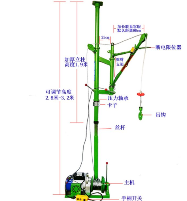 單立柱菠萝网站在线观看的優點是上頂天下頂地,安裝簡單,不用打孔,吊臂可360度旋轉,支撐杆高度可以調節,電機帶離合可快速下放,一秒到底,可在室內、樓道、陽台等上下距離不太高的場合吊裝沙子、水泥、門窗、護欄等,簡單好用,攜帶方便。