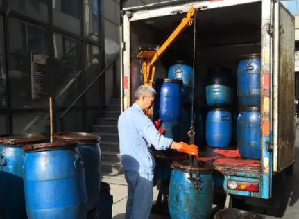 這些廢油被盛放在油桶內,飯店工作人員把油桶搬運到後門挨著的馬路上後,回收公司的司機再操控車上安裝好的車載菠萝网站在线观看,把一桶桶油吊裝到貨車車廂內,既省力又無需直接和廢油桶接觸,幹淨衛生。